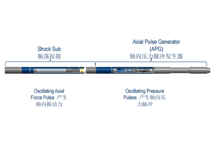 全金属水力振荡器是采用轴向脉冲阀产生压力脉冲,通过震荡短节产生轴向震动, 使静摩擦转化为动摩擦,从而降低摩阻、粘滑、托压、钻压不连续、工具面不稳定卡钻等技术难点问题。